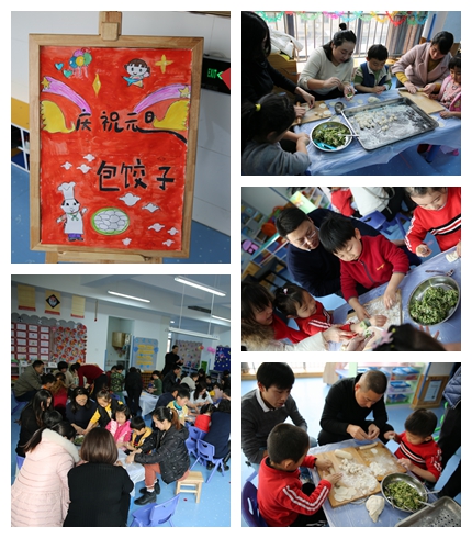 大班年级组的是以《庆“元旦”包饺子》为主题开展亲子活动。家长和小朋友们一同“学”、“做”、“享”,既学习了饺子的来历、文化和制作的技巧,自己动手丰衣足食还与家长一起分享美味和成功的喜悦。小朋友们还以汇报表演形式为家长们展示了本学期五大领域中的学习成果。